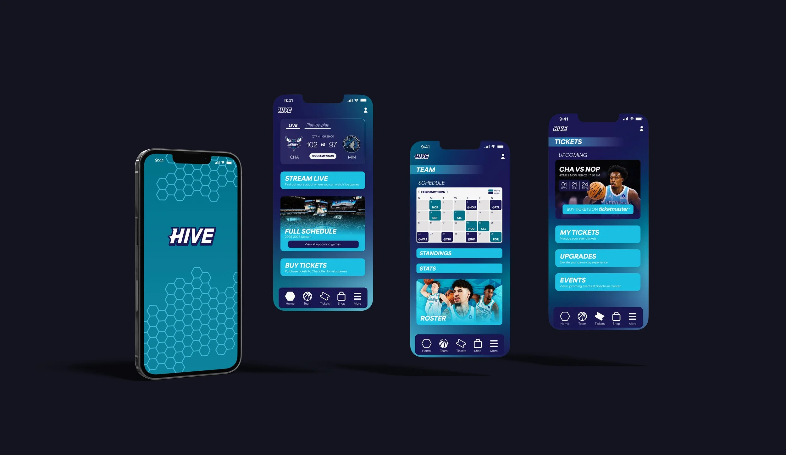 The final solution is a clean, easy to navigate mobile design. The limited color palette and the bold type is consistent with the Charlotte Hornets branding and social media content. The app and widgets are a user friendly way to deliver important information to fans all in one place.