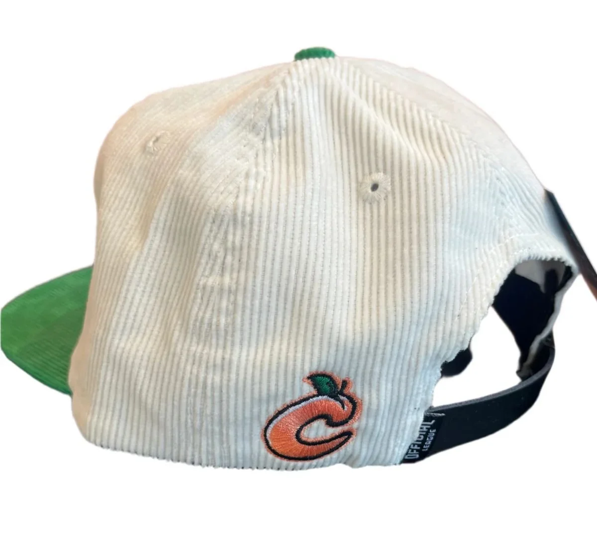 The final hat design that went to production was a white corduroy with a green bill, green button, and black leather strap. It had two Clingstone logos embroidered on it, one on the front of the hat and one on the left side. The hat was available to buy on the Columbus Clingstones website, and it sold out not long after its release!